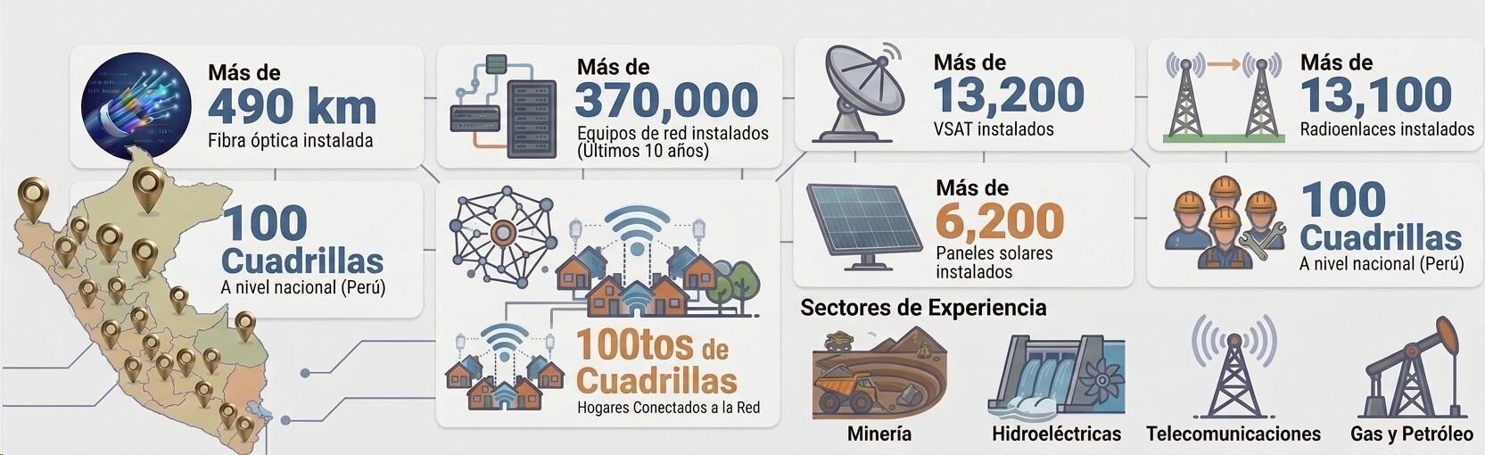 Contamos con 46 años de experiencia en telecomunicaciones, energía y tecnología de la información. Trabajamos con los mejores en minería, utilities y telecomunicaciones, garantizando excelencia y calidad.